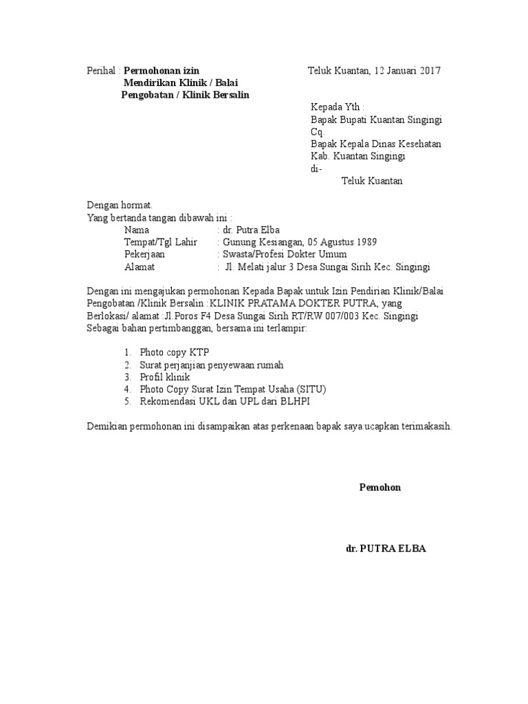 Contoh Surat Permohonan Izin Mendirikan Klinik - Berbagi ... from imgv2-1-f.scribdassets.com Barangkali anda sedang mencari cara menulis surat. Surat permohonan biasanya dipakai oleh seseorang, organisasi, instansi, atau badan usaha untuk mengajukan suatu permohonan secara formal kepada pihak lain. Isi surat, jelaskan alasan pasti mengapa dibuatnya surat tersebut. Surat permohonan di atas materai rp 6.000 pasfoto ukuran 3 x 4 cm sebanyak 2 lembar. Permohonan izin yang telah dibuat diajukan dengan tertulis pada kepala dinkes di kabupaten atau kota. Cara menulis surat izin yang baik dan benar. Oleh karena itu, butuh sebuah surat perizinan contoh surat permohonan izin tidak masuk sekolah. Contoh surat izin adalah sebuah surat yang dibuat dengan tujuan untuk meminta izin kepada penerima bahwa sang pengirim memiliki hajat / acara tertentu sehingga tidak bisa hadir atau melaksanakan kegiatan seperti biasanya.